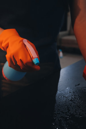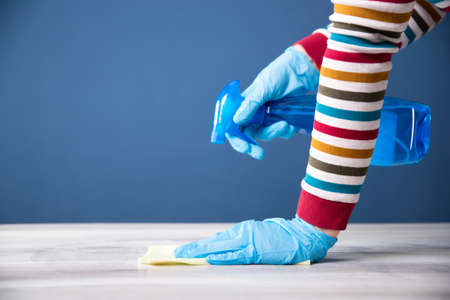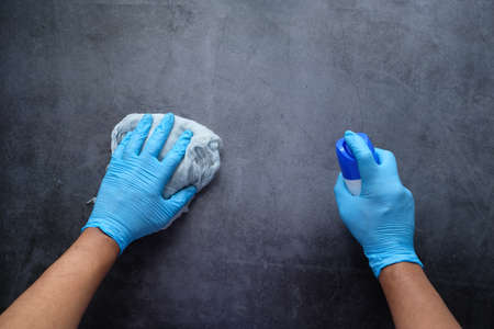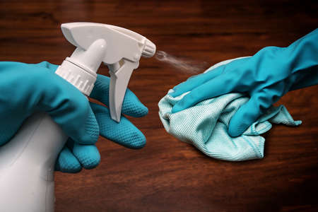 Hands in blue rubber gloves with a cleaning cloth and antibacterial sanitize spray bottle disinfecting a dark wooden surface to prevent covid-19 infection, selected focus