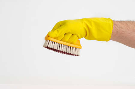 hand in a green rubber cleaning glove holds a plastic brush on a white background