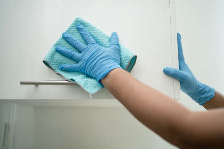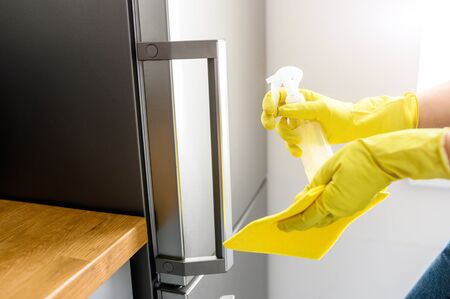 Hands of a woman in protective rubber gloves is cleaning and disinfecting handle of the refrigerator, the face is not visible