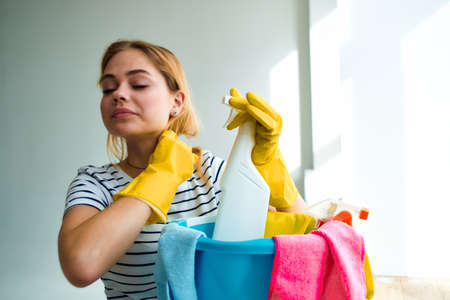 Happy housewives in rubber gloves with dust-wiping equipment, aerosol cleaners ready cleaning. concept do housework.