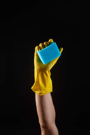 A hand in a yellow protective rubber glove holds a black washing sponge on a black background