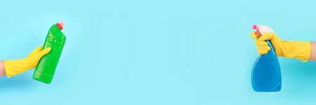 Hands in yellow protective rubber glove holding spray bottle and green bottle with detergents against blue background with copy space. Cleaning product for different kitchen or bathroom surfaces. CBanner for ceaning service. Mockup image
