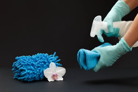 Hands in rubber gloves holding a plastic bottle of washing liquid and a doormat, a rag, an orchid flower on the black