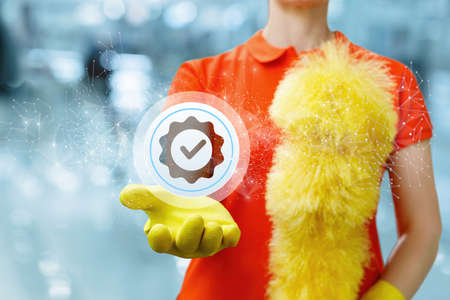 Cleaner maid woman wearing protective yellow gloves holding smartphone for copy space. Application maid service.