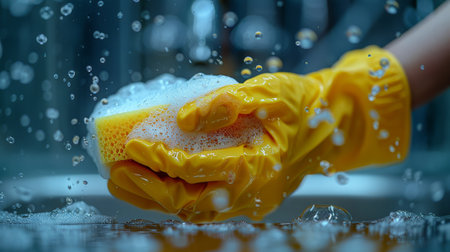 Hand wearing yellow glove holding soapy sponge with water splashes in the foreground, close-up view. Cleaning and hygiene concept.