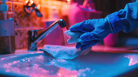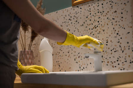 Female hands cleaning bathroom washing washbasin in protective gloves at home