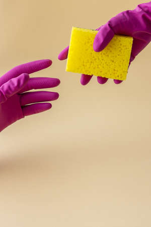 cleaning products, blue sponge for hands with yellow rubber gloves.