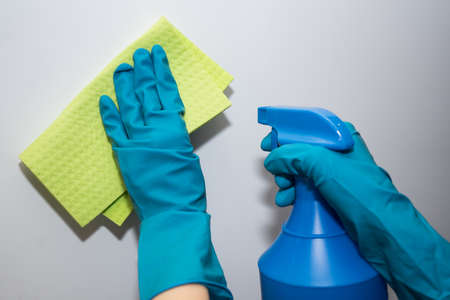Female hands in rubber gloves hold a rag and spray on blue background.
