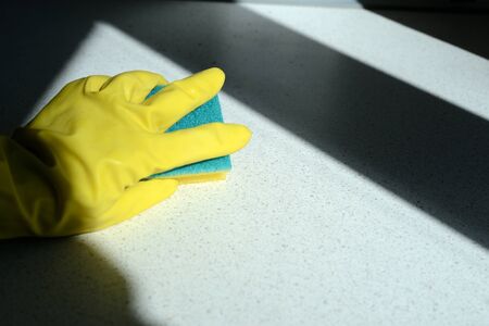 Hand in yellow rubber glove washing kitchen surface lit by the sun. Home cleaning