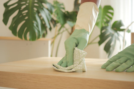 hand in green rubber glove wipes the table with a yellow fiber rag, the concept of cleanliness in the house, cleaning in the house
