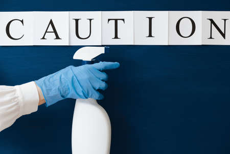 Sanitize surfaces prevention in hospitals and public spaces. Surface home cleaning spraying antibacterial sanitizing spray bottle. disinfecting against COVID-19 spreading, wearing medical blue gloves.