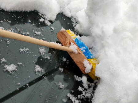 cleaning snow from a car windshield