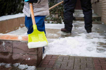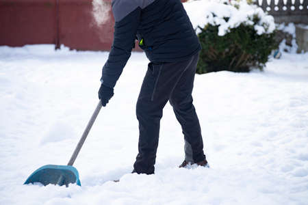 Snow removal with a snow shovel in winter