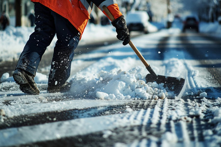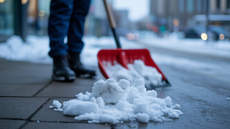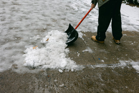 close up of adult cleaning snow from sidewalk and using snow shovel after heavy snowstorm