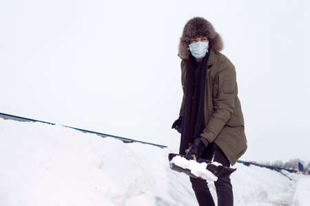 Moscow. Russia. February 12, 2021. A utility worker wearing a protective mask shovels snow with a shovel on a city street during a snowfall on a winter day.