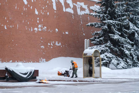 Moscow. Russia. February 12, 2021. Utility workers remove snow with a snow blower and shovels during a snowfall near the Kremlin wall at the grave of the unknown soldier on a winter day.