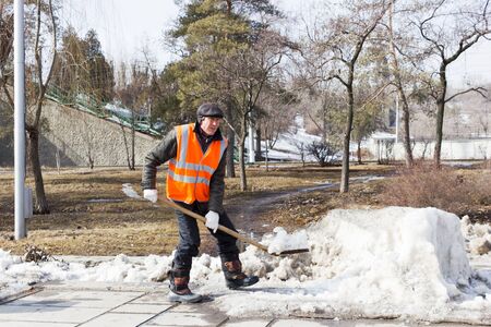 A man shovels snow with a shovel. Cleaning, winter, season, street, work