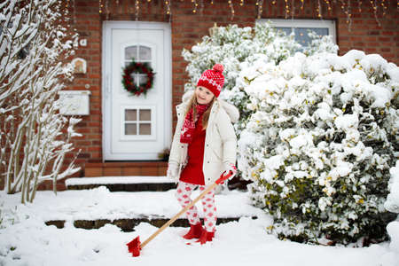 Child shoveling snow. Little girl with spade clearing driveway after winter snowstorm. Kids clear path to house door after Christmas blizzard. Snowfall fun. Children play in cold frosty garden.