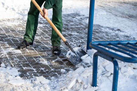 Removing snow from sidewalk after snowfall. Man using snow shovel on street in winter
