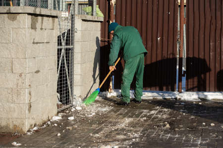 A manual worker sweeps the remnants of snow off a wet pavement with a broom