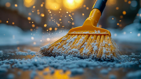 An orange snow shovel in the foreground and in the second a worker is sweeping the sidewalk out of the snow