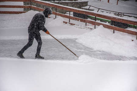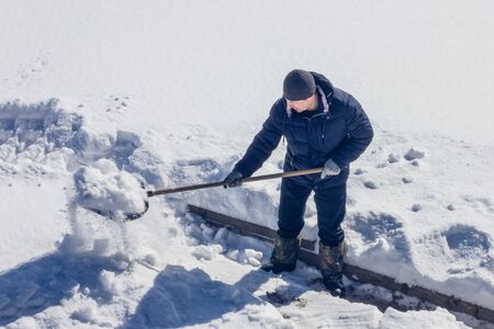 Removal snow from driveway after snowfall. Man using snow shovel on street in winter