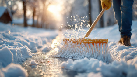 Person shovels snow from the sidewalk on a cold winter day in a residential area