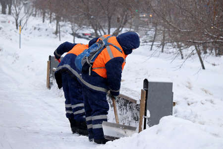 Snow removal in winter city, street cleaning during blizzard. Two communal services workers in orange uniform with a shovel clears snow on a sidewalk