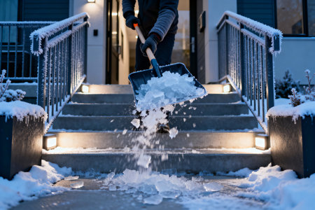 A person is removing ice from the front steps of a house during winter, ensuring safe passage