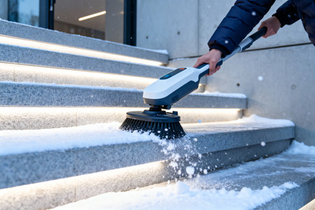 A person is using a snow brush to remove snow from outdoor steps, preparing for safe passage
