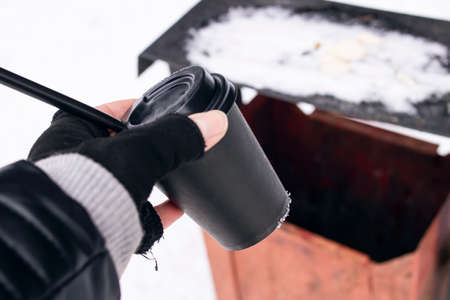 Hand throws a paper glass of coffee into an urn