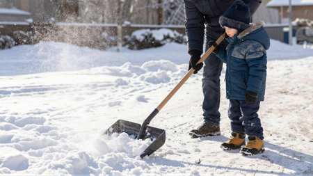 Child helping father clearing snow from sidewalk. Candid authentic family winter activities. Snow shoveling concept.