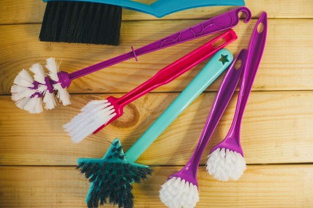 Cleaning house or office concept. Dark stone background with plastic clothes brushes ,top view, flat lay