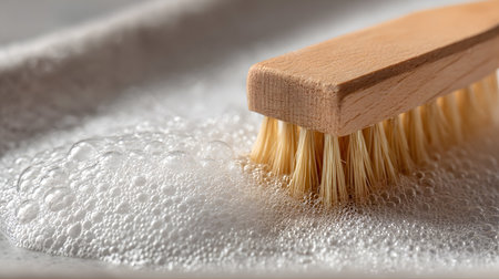 A close-up photo of a brush's bristles with water droplets on a smooth surface. The image emphasizes cleanliness and grooming in everyday hygiene routines.