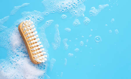 Wooden brush for cleaning clothes with foam of powder detergent water dissolution on blue backgrond. Top view