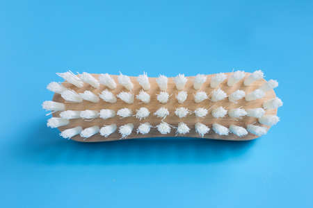 Light blue cleaning brush on a blue background. Minimal cleaning concept. flat lay.