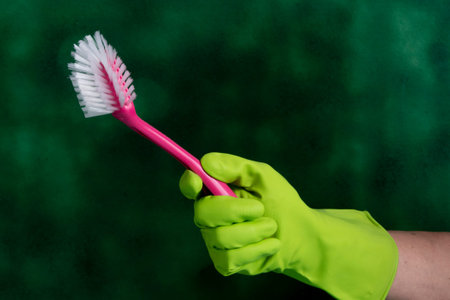 Gloved hand holding a cleaning brush with free space on the left: cleaning concept.