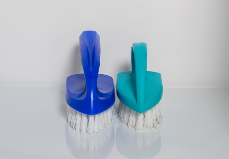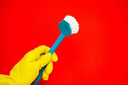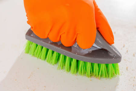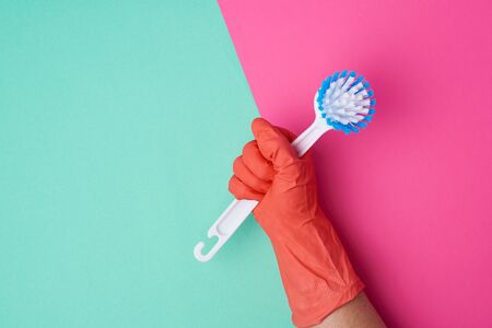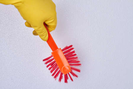 white plastic cleaning brush in hand, protective orange glove on hand, color background