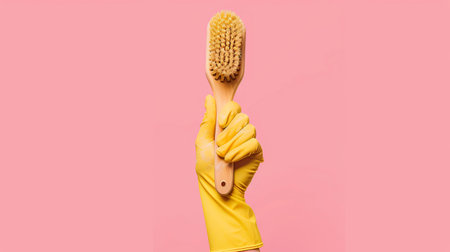 Yellow-gloved hand holding wooden brush, pink background. ai generated
