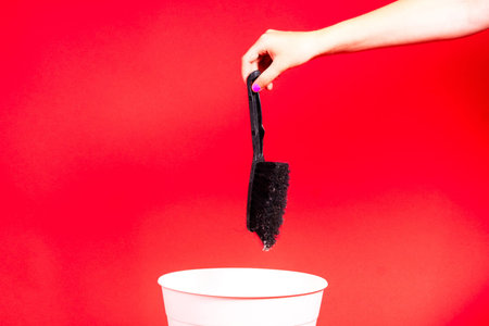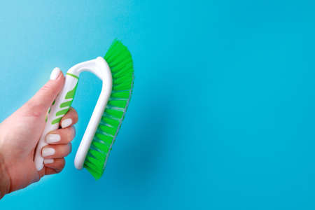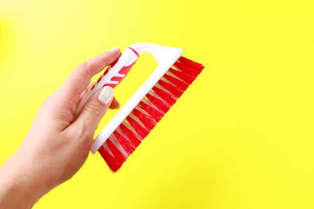 womans hand holding Cleaning brush on color background. Brush for cleaning clothes, carpets. Tool for home care.