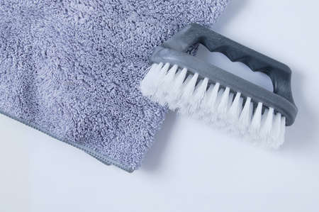Gray household brush with stiff bristles and a rag for cleaning on a white background.