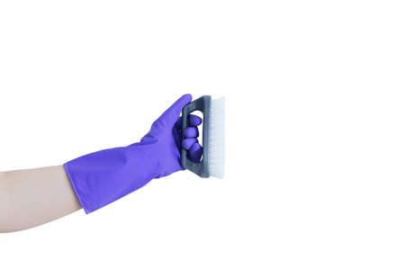 Hand of a Caucasian woman in a purple protective glove with a cleaning brush.