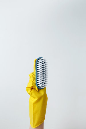 Hand in yellow rubber glove holding scrub brush with blank background ai generated