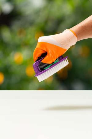 Close-up view of a man's hand in a rubber protective glove with a plastic brush on the blurred natural background. Washing and cleaning concept.