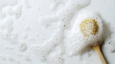 A serene composition featuring soft bubbles and a natural wooden brush on a light background, perfect for conveying relaxation and wellness in spa settings.