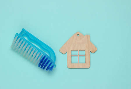 Brush for cleaning and mini house figure on blue pastel background. Top view
