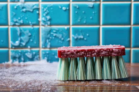 Close-up of a scrub brush scrubbing dirt off a rock floor, with soap suds and water splashing around.