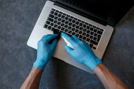 practice good hygiene against viruses and bacteria, hand with cleaning gloves disinfecting laptop keyboard with wipe
