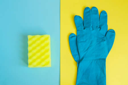 Professional concept of cleaning the house, accessories for a spring cleaning, blue rubber gloves and cleaning sponge on a double yellow and blue background, flat lay.