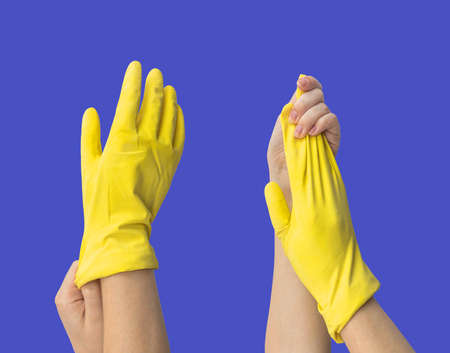 worker's hand in a yellow rubber protective glove with a purple sponge or dishwashing. A maid or housewife takes care of the house. general or regular cleaning.
